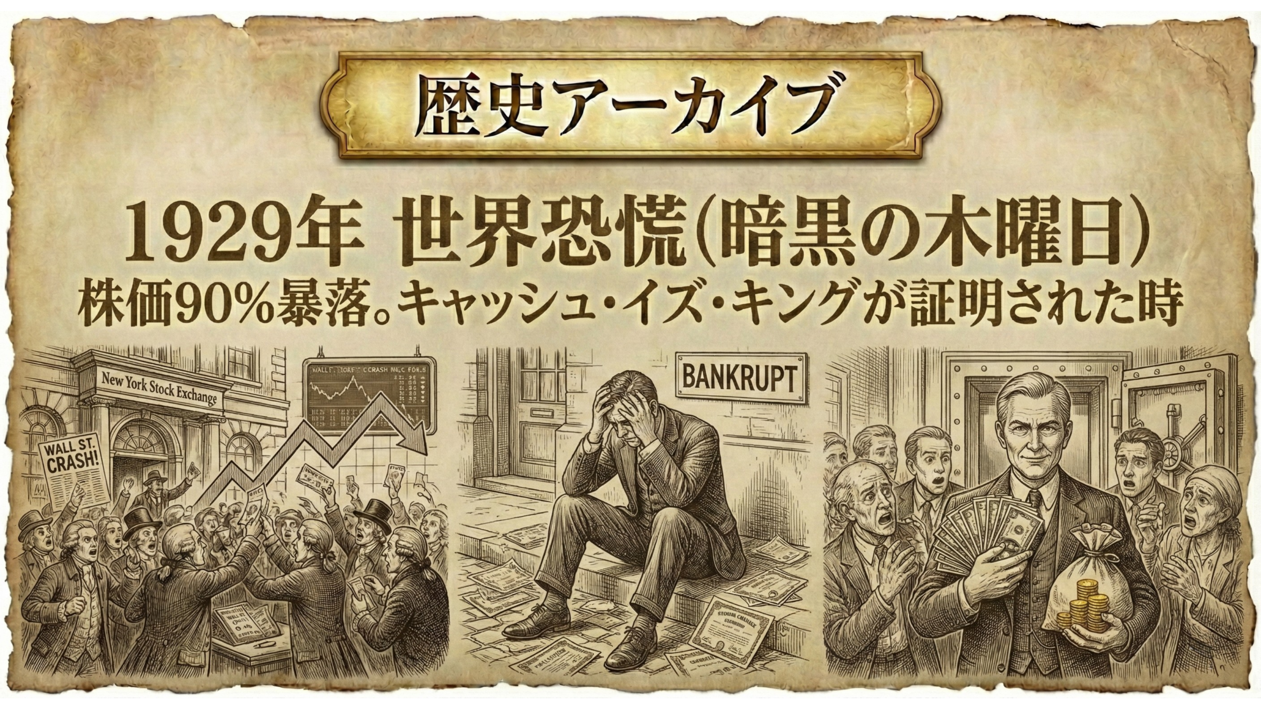 1929年 世界恐慌(暗黒の木曜日):株価90%暴落。キャッシュ・イズ・キングが証明された時
