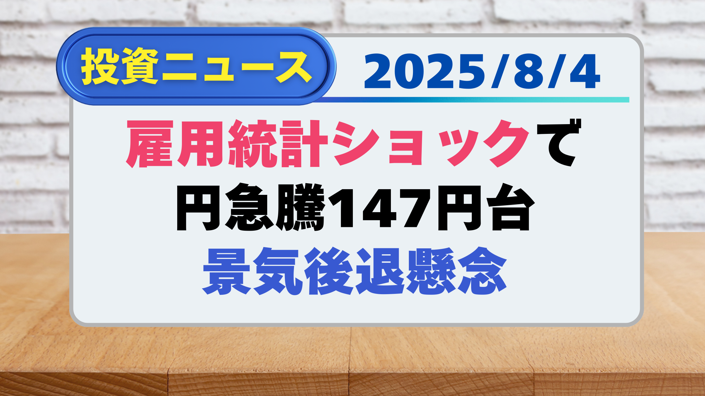 【投資ニュース】雇用統計ショックで円急騰147円台、景気後退懸念(8/4)