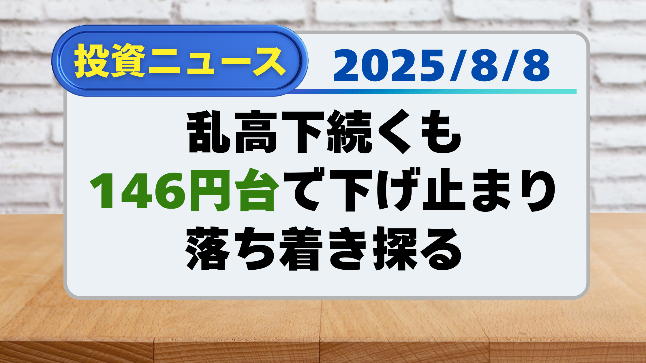 【投資ニュース】乱高下続くも146円台で下げ止まり、落ち着き探る(8/8)