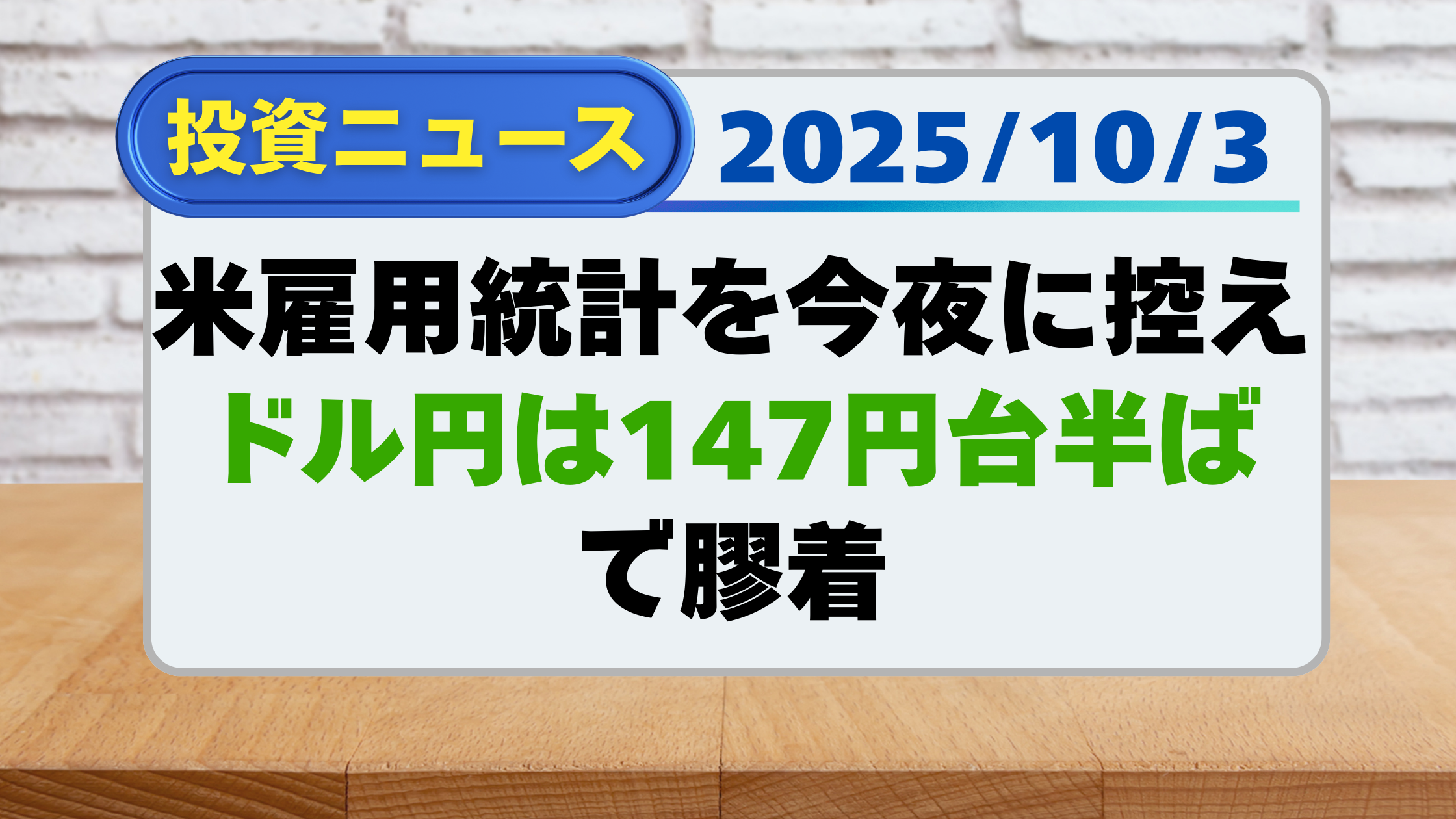 【投資ニュース】米雇用統計を今夜に控え、ドル円は147円台半ばで膠着(10/3)