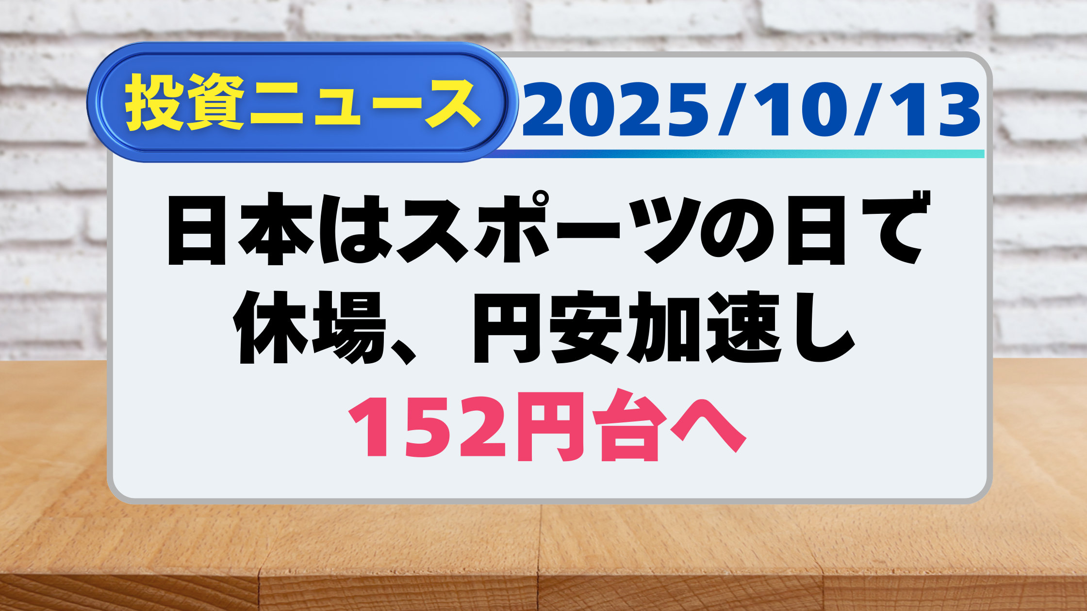 【投資ニュース】日本はスポーツの日で休場、円安加速し152円台へ(10/13)